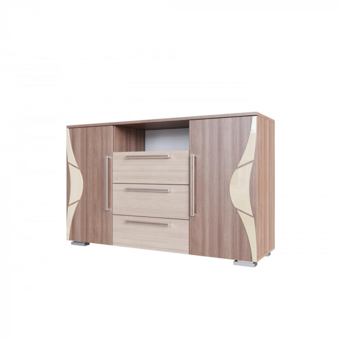 CARACTERISTICI GENERALE Tip produs Comoda Utilizat pentru Living Dormitor Stil Modern Numar usi 2 Numar sertare 3 Stare asamblare Neasamblat Finisaj Melaminat Culoare Shimo DETALII MATERIAL Tip fronturi Pal melaminat + MDF Material Pal melaminat 16mm DIMENSIUNI Lungime 135 cm Latime 40 cm Inaltime 84 cm Greutate 50 Kg