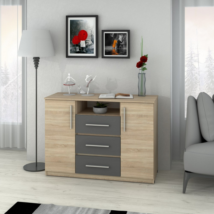 Material : ● Corp: Pal melaminat Sonoma ● Front: Pal melaminat Sonoma+Gri Dimensiuni : ● Lungime 120 x Adancime 45 x Inaltime 86cm Caracteristici : ● Material Lucios la fronturi ● Manere Aluminiu ● 3 sertare + 2 usi Produsul se livreaza in pachet, cu schita de montaj si feroneria necesara pentru asamblare !
