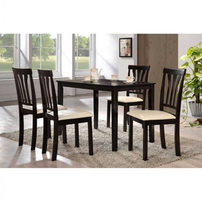 Set format din masa de lemn si 4 scaune tapitate, ideal pentru livingul sau bucataria dumneavoastra. Datorita materialului din care este confectionat, este o investitie de durata, avand rezistenta in timp. Cu un design ce nu se demodeaza usor, lemnul de culoare wenge, se integreaza usor in ambientul casei dumneavoastra. Scaunele sunt capitonate cu burete pe sezut si apoi tapitate cu stofa rezistenta in timp.