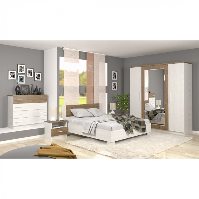 CARACTERISTICI GENERALE Tip produs Set mobila dormitor Utilizat pentru Dormitor Stil Modern Numar corpuri mobilier/set 5 Numar dulapuri 1 Numar usi 4 Numar sertare 6 Stare asamblare Neasamblat Finisaj Melaminat Culoare Pin Anderson + Stejar April DETALII MATERIAL Tip fronturi Pal melaminat Material Pal melaminat 16mm Esenta lemn Stejar DIMENSIUNI Dimensiuni dulap (cm) 201 x 58 x 215 cm Dimensiuni pat (cm) 166 x 204 x 85 cm Dimensiuni noptiera (cm) 51 x 37 x 46 cm Dimensiuni comoda (cm) 103 x 40 x 92 cm