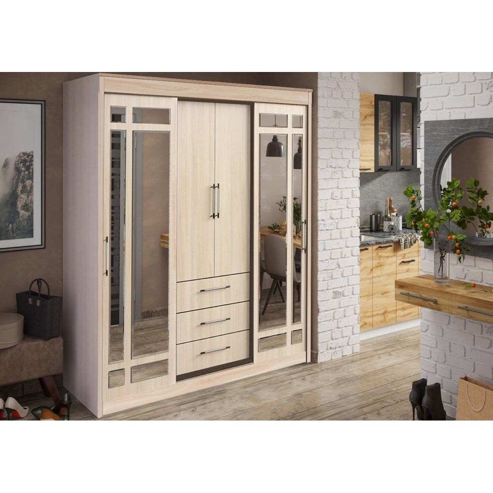 Dimensiuni : Lungime 170 x Adancime 60 x Inaltime 210cm Nuante: Corp : PAL melaminat Frasin shimo deschis Front: PAL melaminat Frasin shimo deschis + Oglinda Caracteristici : - Dulapul este pervazut cu bara haine si rafturi pentru depozitare - 3 sertare - Oglinda Produsul se livreaza in pachete , cu schita de montaj si feroneria necesara pentru asamblare !