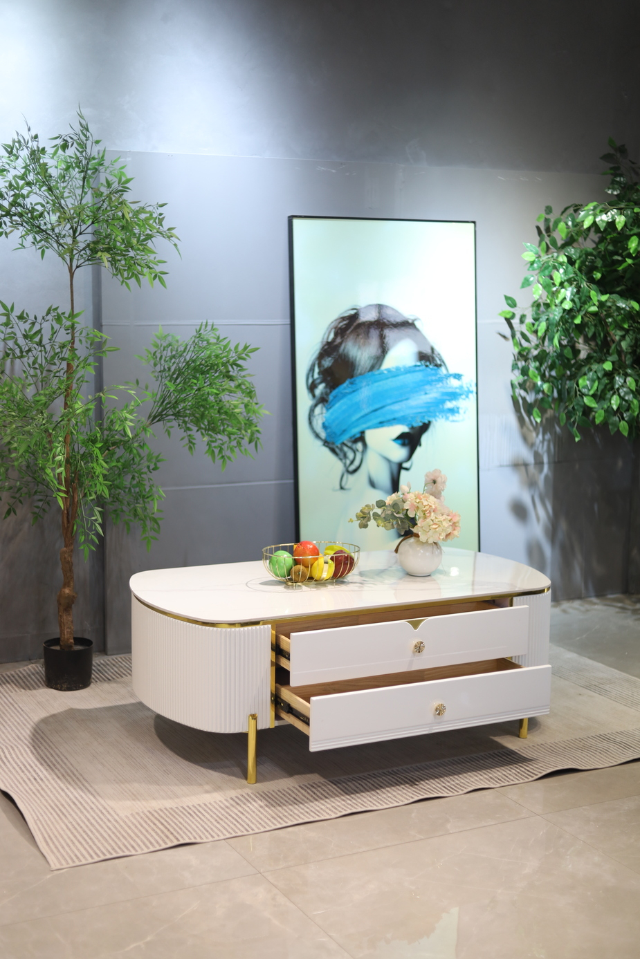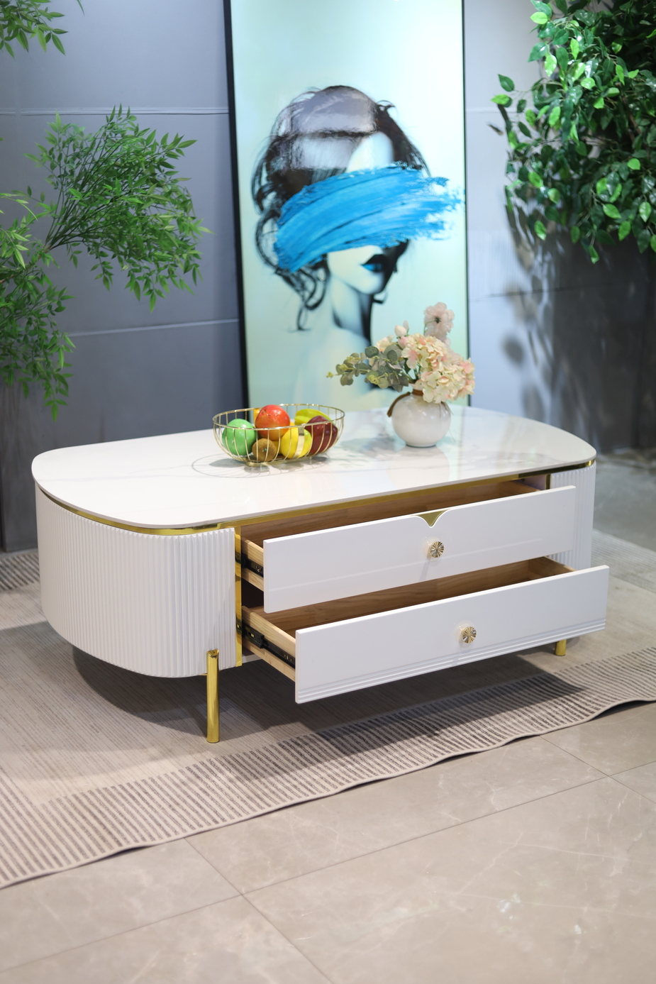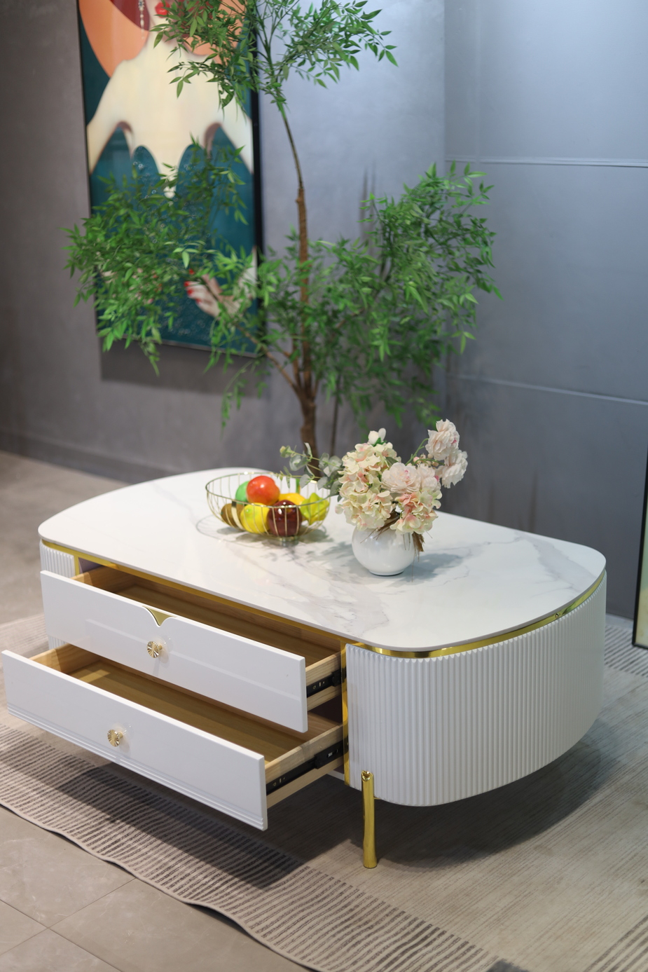 Masa de cafea albă din MDF, cu sertare practice pentru depozitare, are un design elegant și modern. Blatul din piatră sinterizată adaugă un aspect sofisticat și rezistent, fiind ușor de întreținut. Combinația între materialele de calitate și stilul rafinat face din această masă o piesă de mobilier ideală pentru orice living.