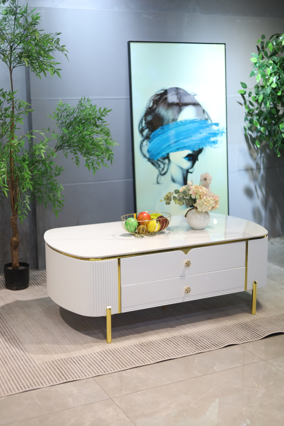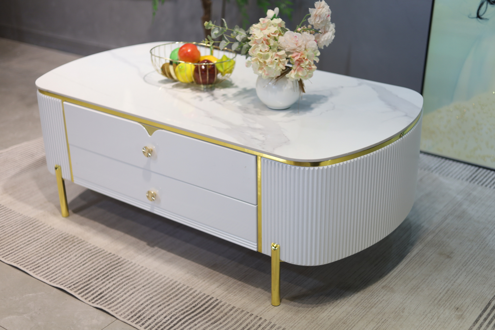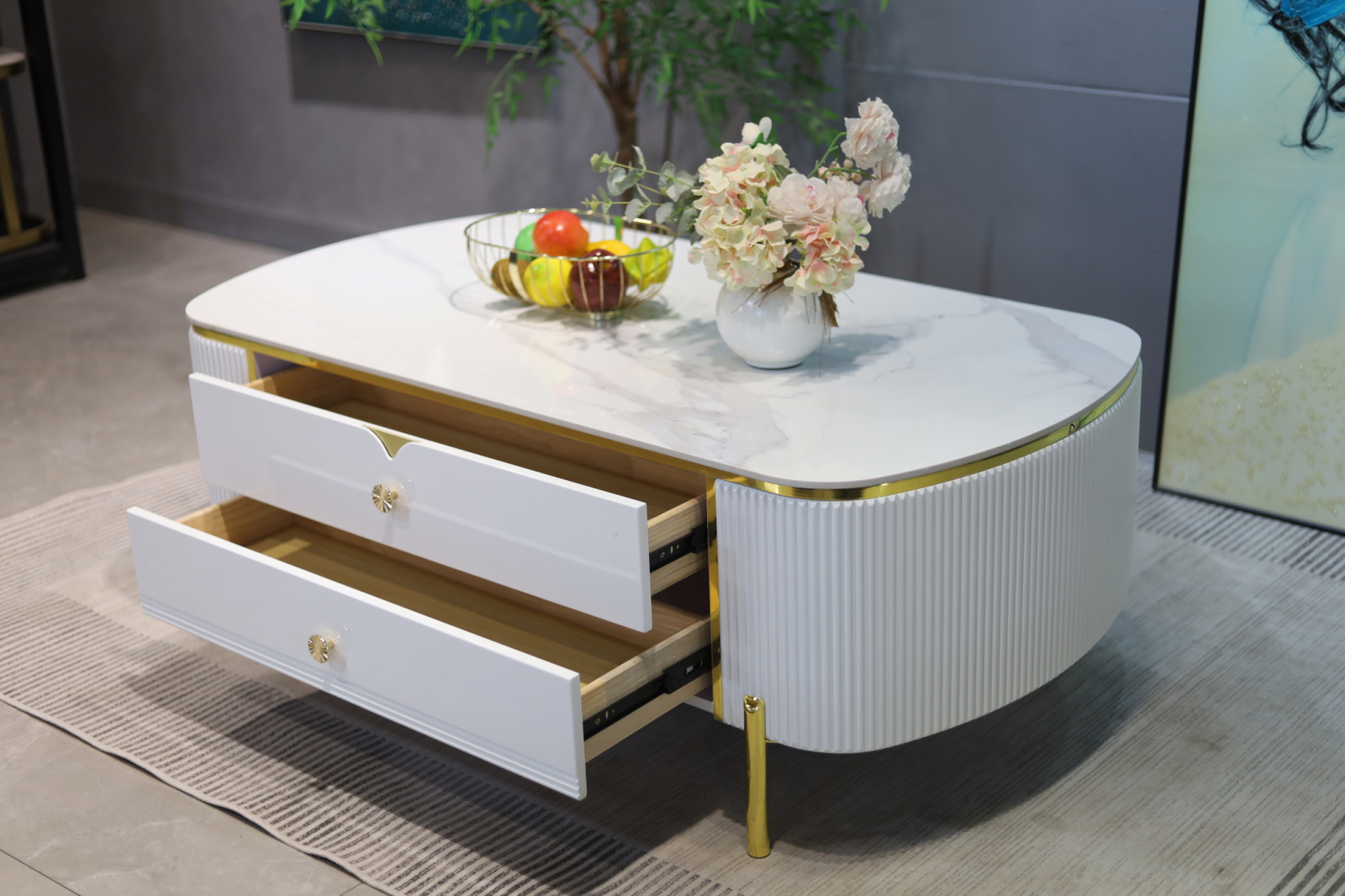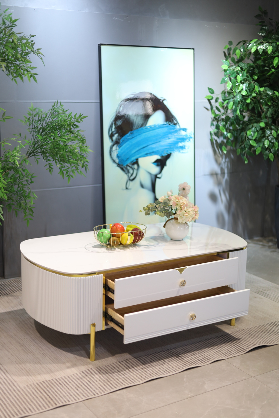 Masa de cafea albă din MDF, cu sertare practice pentru depozitare, are un design elegant și modern. Blatul din piatră sinterizată adaugă un aspect sofisticat și rezistent, fiind ușor de întreținut. Combinația între materialele de calitate și stilul rafinat face din această masă o piesă de mobilier ideală pentru orice living.