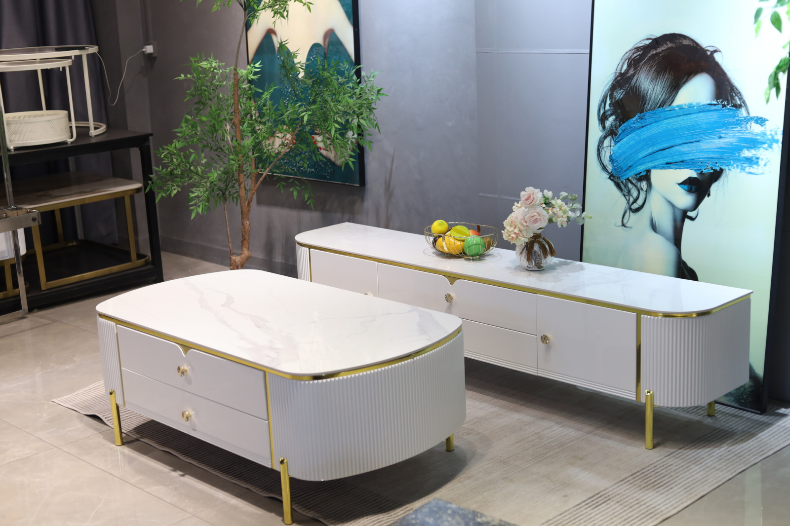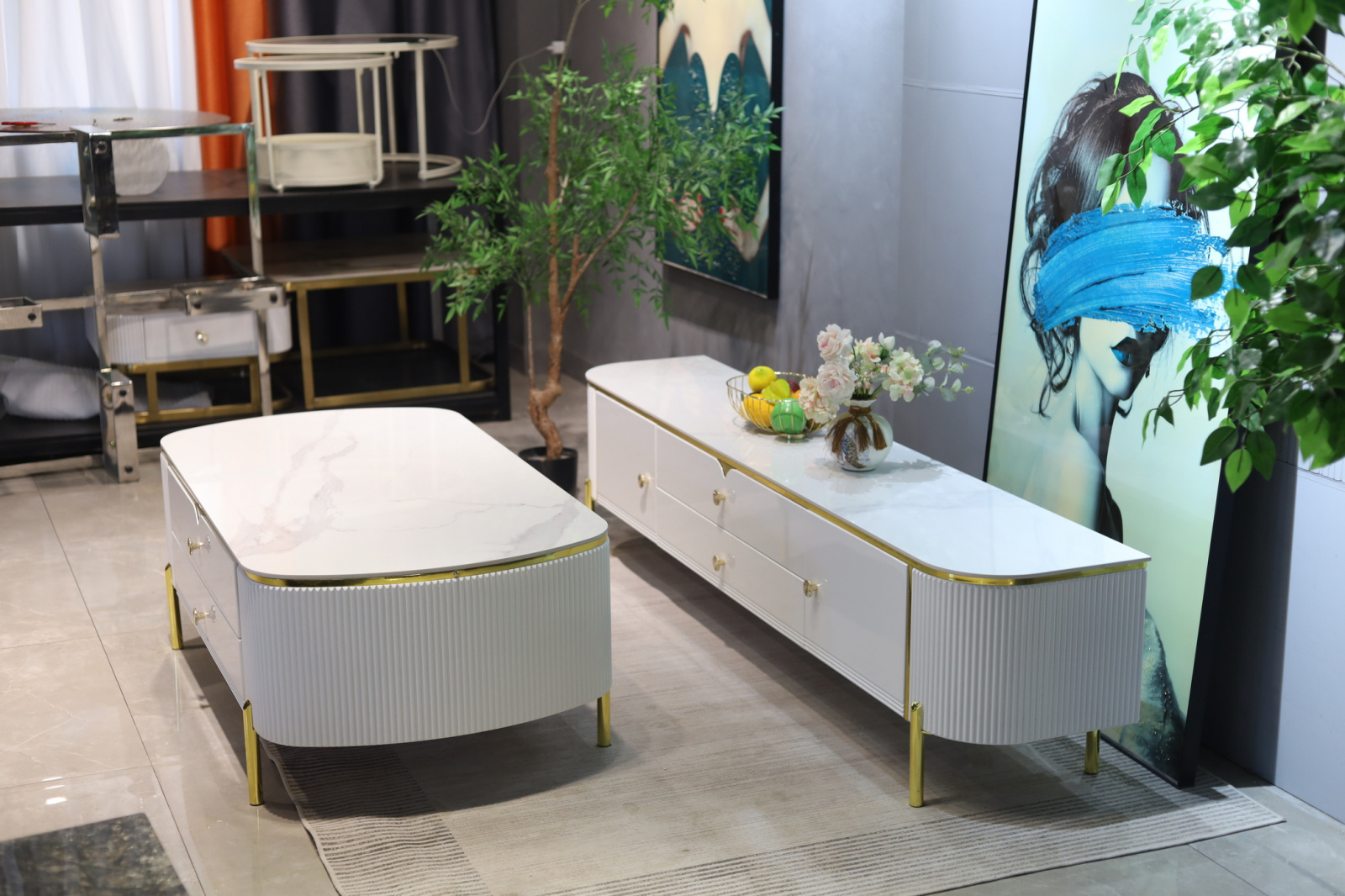 Setul format din masă de cafea și comodă TV, ambele albe, combină eleganța și funcționalitatea. Făcute din MDF de calitate, acestea sunt dotate cu blaturi din piatră sinterizată, care adaugă un aspect sofisticat și sunt ușor de întreținut. Designul modern și detaliile rafinate fac din acest set alegerea perfectă pentru un living contemporan.