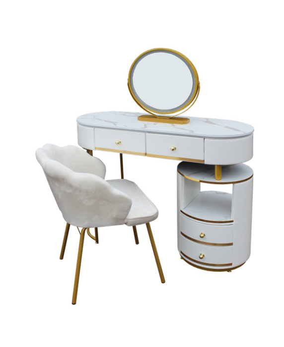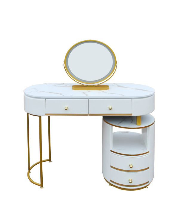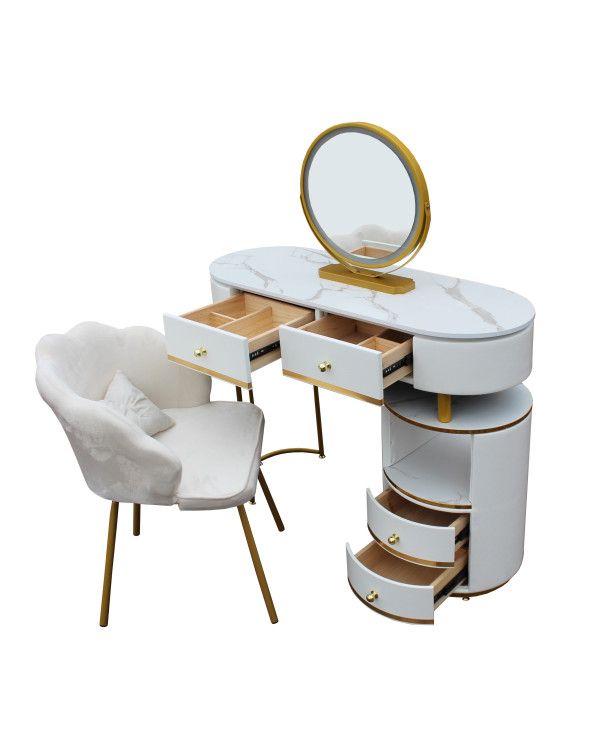 ● Această masă de toaletă are 2 sertare și un dulap de depozitare, oferind suficient spațiu pentru a vă ajuta să vă puneți toate produsele de îngrijire a pielii; cosmeticele, bijuterii, uscător de păr, ondulator și alte articole de înfrumusețare. Unul dintre sertarele mari are compartimente suplimentare care pot fi împărțite pentru depozitarea bijuteriilor.